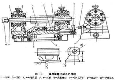 圖1為鏜削車床尾架孔的雙支承鏜模,鏜模的兩個(gè)支承分別設(shè)置在刀具的前方和后方,鏜刀桿9和主軸通過(guò)浮動(dòng)接頭10聯(lián)接。工件以底面槽及側(cè)面在定位板3、4及可調(diào)支承釘7上定位,限制六個(gè)自由度,采用聯(lián)動(dòng)夾緊機(jī)構(gòu)夾緊,擰緊夾緊螺釘6,壓板5、8同時(shí)將工件夾緊。鏜模支架1上用回鏜套2來(lái)支承和引導(dǎo)鏜杜。鏜模以底面A安裝在機(jī)床工作臺(tái)上,其位置用B面找正。