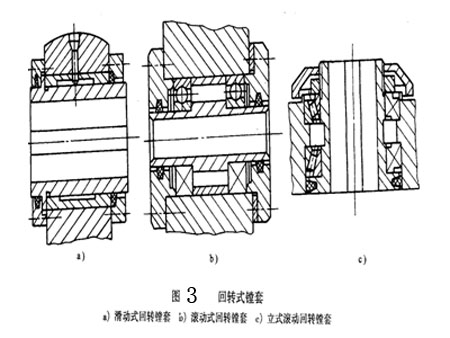 圖3為滑動(dòng)式回轉(zhuǎn)鏜套,其結(jié)構(gòu)尺寸較小,回轉(zhuǎn)精度高,減振性好,承載能力大,但需要充分潤(rùn)滑,摩擦面的線速度不能大于0.3-0.4m/s,常用于精加工。圖3b為滾動(dòng)式回轉(zhuǎn)鏜套,用于臥式鏜孔,由于鏜套與支架之間安裝了滾動(dòng)軸承,所以回轉(zhuǎn)線速度可大大提高,一般u>0.4m/s,但是徑向尺寸較大,回轉(zhuǎn)精度受軸承精度影響。圖3c為立式鏜孔用的回轉(zhuǎn)式鏜套。它的工作條件差,受切液和切屑的沖刷,一般設(shè)有防屑結(jié)構(gòu),并采用圓錐滾子軸承。