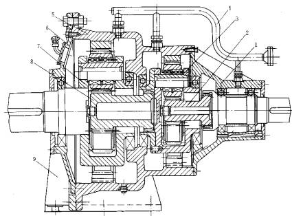 1—輸入軸 2—太陽(yáng)輪 3—輸入行星架 4—潤(rùn)滑管路 5—機(jī)體 6—后機(jī)蓋 7—輸出行星架
