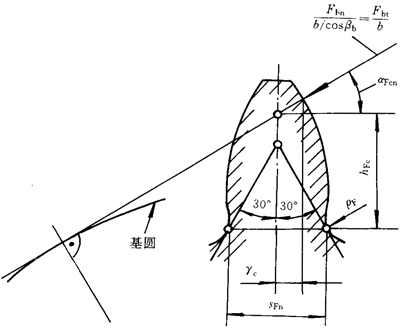 齒形系數(shù)是用以考慮齒形對名義彎曲應(yīng)力的影響,以過齒廓根部左右兩過渡曲線與30°切線相切點(diǎn)的截面作為危險(xiǎn)截面進(jìn)行計(jì)算。