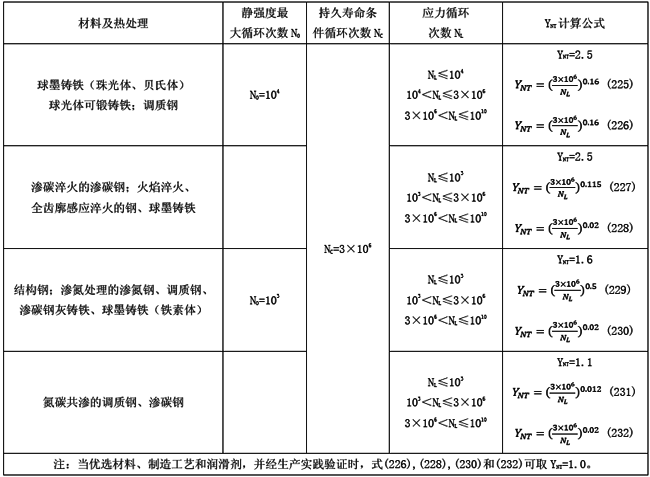 彎曲強度和壽命系數(shù)YNT應根據(jù)實際齒輪實驗或經(jīng)驗統(tǒng)計數(shù)據(jù)得出的S-N曲線求得,它與材料、熱處理、載荷平穩(wěn)程度、輪齒尺寸及殘余應力有關。當直接采用S-N曲線確定和S-N曲線實驗條件完全相同的齒輪壽命系數(shù)YNT時,應取系數(shù)YδrelT,YRrelT,Yx的值為1.0。