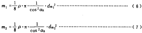 在設(shè)計(jì)階級(jí),精確確定小、大錐齒輪的當(dāng)量質(zhì)量m1及m2是困難的。對(duì)常見(jiàn)的錐齒輪結(jié)構(gòu)?山频匾詣(dòng)力當(dāng)量圓柱齒輪(見(jiàn)圖2)質(zhì)量來(lái)代替。于是,m1和m2可按公式(6)、(7)計(jì)算。