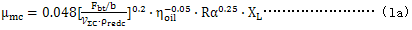 沿嚙合線(xiàn)的平均摩擦因數(shù)μmc,可由測(cè)量[1]得到與由公式(1)估計(jì)出。雖然,局部磨擦因數(shù)在節(jié)點(diǎn)C接近于零,當(dāng)引入公式(1)時(shí),其平均值可用節(jié)點(diǎn)的參數(shù)與油溫Θoil時(shí)油的黏度ηoil大致得出。
