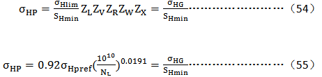 根據(jù)GB/T3480(或ISO6336-5),σHlim是在循環(huán)次數(shù)NL=5×107時(shí)得出的,高速齒輪的循環(huán)次數(shù)可能超過這個(gè)值.當(dāng)NL≤5×107時(shí),可按式(54)計(jì)算σHP;當(dāng)NL>5×107時(shí),在給出合適的條件(材料、制造)和有使用經(jīng)驗(yàn)時(shí),仍可按式(54)計(jì)算σHP,滯則,由式(55)計(jì)算σHP。