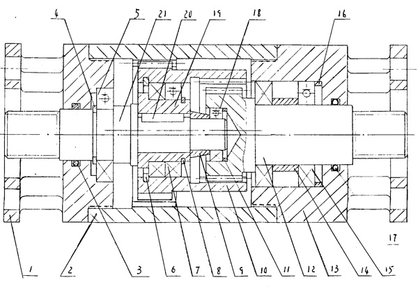 | 一種潛油減速機,由左端蓋、內(nèi)齒輪、O形圈、擋圈、軸承、定距套、雙聯(lián)齒輪、調(diào)整環(huán)、齒輪軸、右端蓋、偏心套、鍵、軸組成,其特征是:左端蓋內(nèi)裝O形圈,在軸上安裝軸承并用擋圈固定,將軸裝在左端蓋上,把鍵裝在軸右端,并將偏心套裝在軸上,在雙聯(lián)齒輪上安裝擋圈及軸承,并一起裝在偏心套上,用擋圈固定,定距套裝在軸的右端,內(nèi)齒輪與左端蓋靠螺紋連為一體,右端蓋內(nèi)裝O形圈,并安裝調(diào)整環(huán)、軸承、定距套,在齒輪軸左端裝調(diào)整環(huán)和軸承,并一起裝入右端蓋內(nèi),連同整體靠螺紋與內(nèi)齒輪連為一體。左端蓋與電動機把合,右端蓋與油泵把合。 |