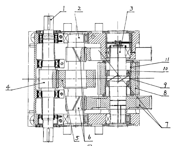 | 本實(shí)用新型提供了一種水泥磨機(jī)用單邊雙傳動減速機(jī),主要由第一軸1、第二軸2及第三軸3組成,其特征在于:第一軸1與第三軸3之間有第二軸2,第三軸3有兩個,兩個第三軸與第二軸2的軸間距相等,第一軸1上的小齒輪4與第二軸2上的大齒輪5為直齒嚙合,第二軸2上的小齒輪6同時與兩個第三軸3上的大齒輪7斜齒嚙合,并且同一軸上的兩個小齒輪6或大齒輪7螺旋方向相反,螺旋角相等,第三軸3的中部設(shè)置有圓柱齒輪8。本實(shí)用新型結(jié)構(gòu)簡單、緊湊,體積小,并且動力傳遞的均載同步性好。 |