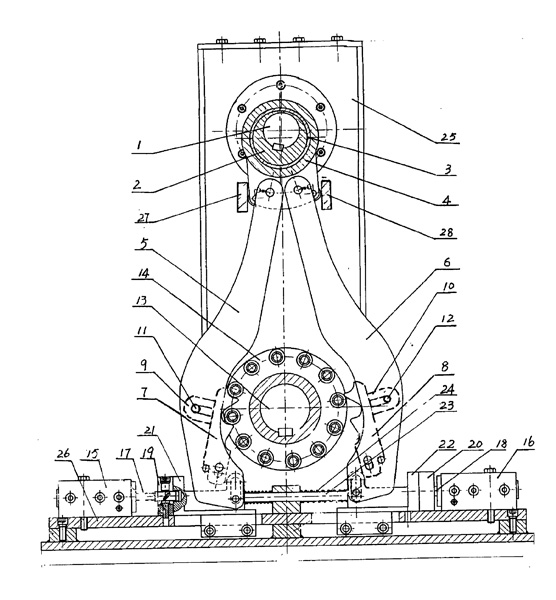 | 一種換向減速機包括殼體,換向裝置,主動輪,被動輪,輸出軸,輸入軸,其特征在上述所述的輸入軸(1)上固定偏心輪(2),偏心輪(2)外圓上有偏心軸承(3),偏心輪軸承(3)外圓上有拉板套(4),拉板套(4)上分別鉸連左拉板(5)、右拉板(6);左拉板(5)上鉸連左拉鉤(7),左拉鉤(7)上固定左拉鉤導塊(9);用左拉鉤導塊銷(11)與左拉板(5)鉸連;在右拉板(6)上鉸連右拉鉤(8),右拉鉤(8)上固定右拉鉤導塊(10)用右拉鉤導塊銷(12)與右拉板(6)鉸連,在輸出軸(13)上固定套筒滾子輪(14),在底板(26)上固定左程控液力缸(15)、右程控液力缸(16),左拉板導板(21),右拉板導板(22);在左程控液力缸(15)內裝左柱塞(17),用左拉板鎖定器(19)與左拉板導板(21)連接,在右程控液力缸(16)內裝有右柱塞(18),用右拉板鎖定器(20)與右拉板導板(22)連接,解鎖彈簧(24)套在推桿(23)上,拉板套(4)兩側設置有左限位板(27),右限位板(28)。 |