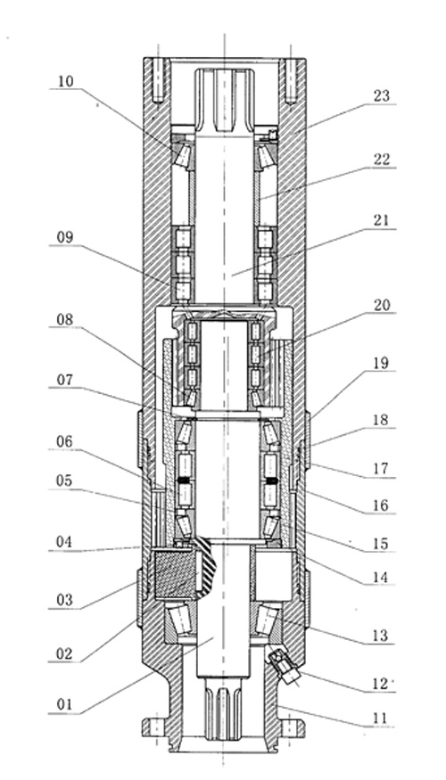| 深井減速機(jī),包括雙聯(lián)行星齒輪、輸入軸、輸出軸、軸承,其特征是:雙聯(lián)行星齒輪(17)通過承受徑向載荷的軸承(06)和承受軸向載荷的軸承(15)安裝在輸入軸(01)的偏心軸頸上,輸入軸(01)下端用能承受軸向載荷和徑向載荷的軸承(13)安裝在下接頭(11)上;上端用能承受軸向載荷的軸承(08)和承受徑向載荷的軸承(20)安裝在輸出軸(21)下端的小齒輪的孔內(nèi),將輸入軸(01)保持在減速機(jī)的中心位置,雙聯(lián)行星齒輪(17)下端的小齒輪與外殼(16)上的固定齒圈相嚙合;雙聯(lián)行星齒輪(17)上端的內(nèi)齒圈又和輸出軸(21)下端的小齒輪相嚙合,輸出軸(21)用承受徑向載荷的軸承(09)和承受軸向載荷的軸承(10)安裝在上接頭(23)上,在輸入軸(01)上還要安裝一個平衡塊(03),通過鍵(02)固定在輸入軸(01)上。 |