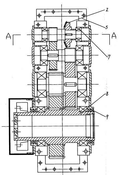 | 本實(shí)用新型提供一種保證潤滑條件,解決潤滑泄漏問題的高油位自潤滑減速機(jī),它有多級(jí)齒輪傳動(dòng),在高位的第一級(jí)傳動(dòng)中采用相互垂直的錐齒輪與錐齒軸嚙合傳動(dòng),錐齒軸的另一端為輸入端,在錐齒軸的輸入端及末級(jí)傳動(dòng)的輸出軸出軸處均采用雙油封密封,上述第一級(jí)傳動(dòng)直接浸泡在潤滑油中,實(shí)現(xiàn)濺油潤滑方式。由于采用了高位第一級(jí)傳動(dòng)為相互垂直的錐齒嚙合,使減速機(jī)的輸入軸與地面平行設(shè)置,同現(xiàn)有輸入軸與地面垂直設(shè)置的立式減速機(jī)相比,其輸入軸軸承位置大大降低,因此可采取濺油潤滑方式,而取消了壓力循環(huán)潤滑方式,這樣就省去了復(fù)雜的外部供油裝置。 |