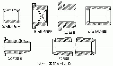 套筒類零件是機械中常見的一種零件,它的應(yīng)用范圍很廣。如支承旋轉(zhuǎn)軸的各種形式的滑動軸承、夾具上引導(dǎo)刀具的導(dǎo)向套、內(nèi)燃機氣缸套、液壓系統(tǒng)中的液壓缸以及一般用途的套筒,如圖 7 - 1 所示。由于其功用不同,套筒類零件的結(jié)構(gòu)和尺寸有著很大的差別,但其結(jié)構(gòu)上仍有共同點,即:零件的主要表面為同軸度要求較高的內(nèi)外圓表面;零件壁的厚度較薄且易變形;零件長度一般大于直徑等。