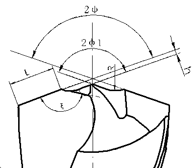 外刃鋒角2F過小時(2F<125°)難以磨出x=150~165°尖角。切屑易卷在容屑槽內(nèi),不宜排除。實踐經(jīng)驗表明,2F=135°~140°,切屑流出方向逼近與鉆頭軸線平行,有利排屑。而且容易形成較大的x角,控制出現(xiàn)“6”字屑。