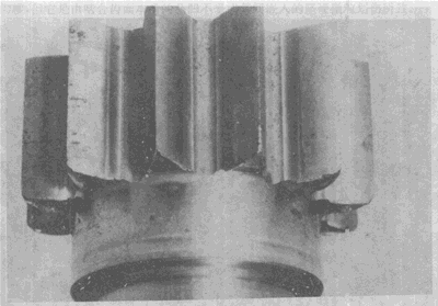 小齒輪正反齒面由于磨料磨損齒頂被磨尖。輪齒的有效齒面是光滑的,但由于相嚙齒輪的齒面上嵌入堅硬微粒使齒面也出現(xiàn)徑向劃痕。