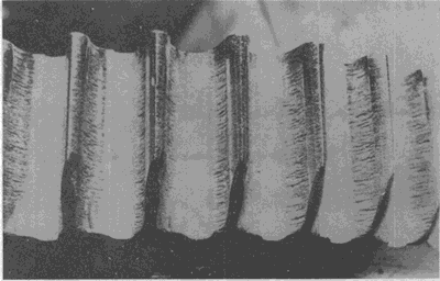 齒面上垂直于滑動方向的微小皺紋。這些小皺紋本身也是波狀的,而不是直的,看上去其形狀如同風(fēng)吹沙土,水沖泥漿一樣,只是規(guī)模小得多而已。