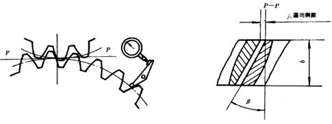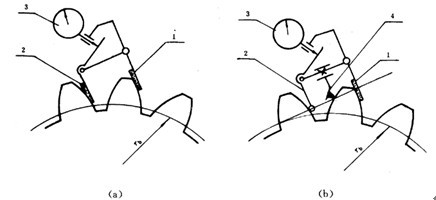 單點(diǎn)法測(cè)量法向側(cè)隙的原理參見圖45。單點(diǎn)測(cè)量法向側(cè)隙時(shí):在中心距和使用時(shí)中心距相同的情況下,可用測(cè)片或塞片進(jìn)行測(cè)量。也可和測(cè)量圓周側(cè)隙相似使用百分表,但要將百分表測(cè)頭放置在與齒面垂直的方向上,此時(shí)從百分表上讀出的晃動(dòng)量即為法向側(cè)隙值。