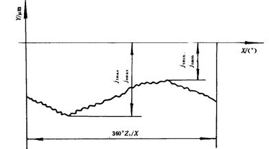 雙嚙法測(cè)量的側(cè)隙在帶零線的徑向綜合誤差曲線(圖47)上取值。X軸就是零線,X坐標(biāo)代表大齒輪的回轉(zhuǎn)角,Y坐標(biāo)代表側(cè)隙。曲線在X坐標(biāo)360°范圍內(nèi),Y坐標(biāo)的最小負(fù)值為jn min(或jt min),最大負(fù)值為jn min(或jt min)。