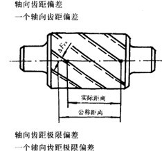 在有效齒寬范圍內(nèi),與齒輪基準(zhǔn)軸線平行面大約通過凸齒或凹齒中部的一條直線上,任一軸向齒距內(nèi),兩個同側(cè)齒面間的實際距離與公稱距離之差。沿齒面法線方向計值。 |