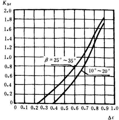 接觸跡系數(shù)是考慮重合度尾數(shù)Δε對(duì)輪齒應(yīng)力的影響系數(shù)。當(dāng)Δε較大時(shí),在相應(yīng)于Δε的齒寬部分,即使在最不利的情況下,也有部分接觸跡參與承擔(dān)載荷,使輪齒應(yīng)力有所下降。推薦Δε=(0.25~0.4)。KΔε值可按Δε由圖3查取。當(dāng)齒端修薄時(shí),應(yīng)根據(jù)減去齒端修薄長度后的有效齒長部分的Δε來查圖(當(dāng)20°<β°<25°時(shí),采用插值法查。。