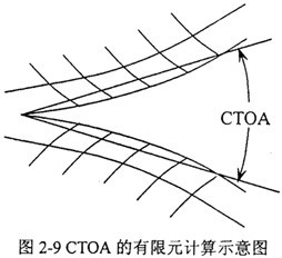 裂紋尖端張開(kāi)角CTOA(Crack Tip Opening Angle)最早被用來(lái)分析核電站管路的穩(wěn)態(tài)裂紋擴(kuò)展,后來(lái)用于輸氣管線(xiàn)和航空工業(yè)。如圖2-2,與裂紋張開(kāi)角COA不同,CTOA對(duì)應(yīng)于一定的斷裂擴(kuò)展?fàn)顟B(tài),不隨測(cè)量點(diǎn)的位置而改變。CTOA在數(shù)學(xué)上可以按下式定義: