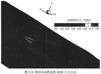 首先觀(guān)察裂尖附近的MISES應(yīng)力分布,如圖2-10。按以針狀鐵素體和塊狀鐵素體組織為主的X70鋼級(jí)管線(xiàn)鋼的平均屈服強(qiáng)度500~600MPa估算,計(jì)算給出的裂尖前部塑性區(qū)長(zhǎng)度大約在3個(gè)單元長(zhǎng)度以?xún)?nèi),即0.15m左右。