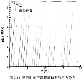 圖2-11直觀(guān)地給出了內(nèi)壓10MPa,裂紋速度216m/s時(shí)一維管道氣體壓力模型(L=1.5D)下的管壁壓力沿軸向的分布。每條曲線(xiàn)的衰減起始點(diǎn)即為該時(shí)刻的裂尖位置。圖中裂尖壓力約為6.6MPa。