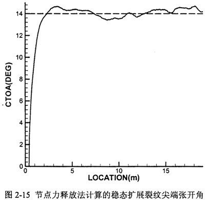 圖2-9表示了CTKOA的計(jì)算方法。由于在裂紋后方有很大的非線(xiàn)性變形,計(jì)算中張開(kāi)位移用割線(xiàn)近似,采用8個(gè)單元的長(zhǎng)度來(lái)計(jì)算CTOA。這一長(zhǎng)度經(jīng)過(guò)與細(xì)化后的網(wǎng)格結(jié)果比較,誤差在10%之內(nèi)。