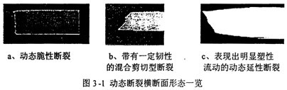 在管道用鋼韌性性能大幅度上升的背景下,20世紀(jì)60年代,延性失穩(wěn)斷裂事故首次在輸氣管線上出現(xiàn)。動態(tài)延性斷裂(DDF)在宏觀剪切面上擴展,與管道表面呈45度傾斜角,有很大的剪切唇,如圖3-lb和圖3-1c所示。雖然這種斷裂的環(huán)境溫度高于鋼材的韌脆轉(zhuǎn)化溫度,但由于鋼材的韌性相對于強度較低,還是使動態(tài)斷裂擴展先于顯著的塑性應(yīng)變而發(fā)生。
