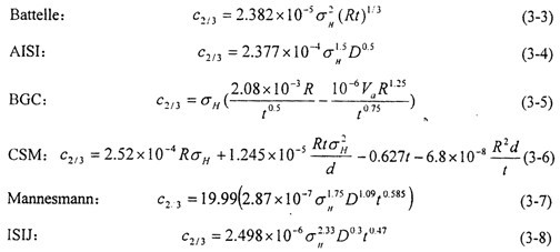 在雙曲線法的基礎(chǔ)上,結(jié)合大量的實驗結(jié)果對止裂韌性進行標(biāo)定,世界各大研究機構(gòu)分別給出了簡便易算的經(jīng)驗公式用以估算臨界止裂韌性,列舉如下: