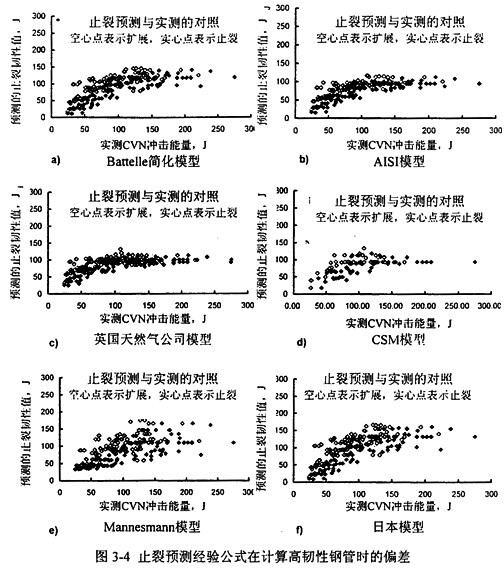 圖3-4表示了Battelle應(yīng)用Maxey雙曲線法對全尺寸實驗數(shù)據(jù)庫所做的DDF止裂韌性預(yù)測,圖3-4a至圖3-4f分別對應(yīng)于式(3-3)至式(3-8)。圖中顯示的實驗用管的鋼級包括X52到Xl00,管徑范圍從4O6mm到1422mm,實驗最高壓力超過16MPa?梢,預(yù)測模型在管材韌性低于某一水平時預(yù)測結(jié)果與實物實驗結(jié)果基本吻合,但當(dāng)管材韌性較高時出現(xiàn)明顯偏差,預(yù)測應(yīng)該止裂的管線沒有止裂。經(jīng)典的止裂預(yù)測模型在預(yù)測夏比能量值高于94J的管材時,已經(jīng)偏于危險,即過高估計了管材的止裂性能。