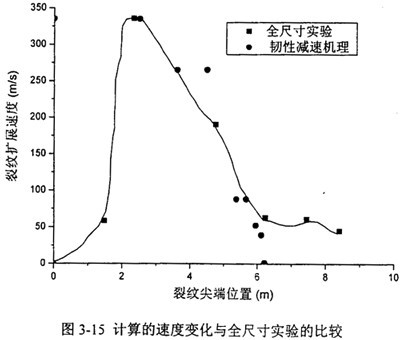 本文通過上述方法,對圖3-9至圖3-12中的全尺寸實測斷裂速度曲線結(jié)果進行了校核,得到了比較吻合的結(jié)果。現(xiàn)以聯(lián)盟管道第一次實驗IE段為例,設(shè)定擴展的初速度為330m/s,速度變化的計算值同實驗對比如圖3-15所示: