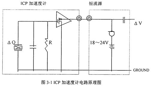 典型的集成壓電式(ICP)加速度計(jì)是在傳統(tǒng)的壓電加速度計(jì)基礎(chǔ)上耦合一個以場效應(yīng)管為核心的內(nèi)裝放大器電路所構(gòu)成。電路原理如圖3-1所示。ICP加速度計(jì)除了能帶來使用方便操作簡化的優(yōu)越性外,較傳統(tǒng)的壓電加速度計(jì)還具有如下一系列的優(yōu)點(diǎn):