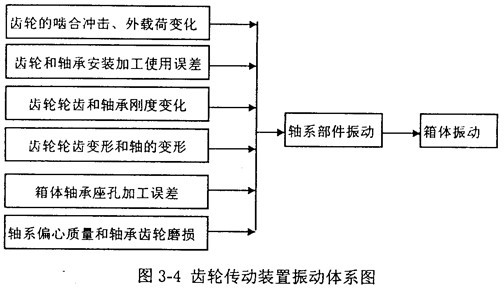 裝有齒輪、軸和軸承的軸系是齒輪傳動裝置的關(guān)鍵部件。在齒輪傳動裝置的工作過程中,箱體與其內(nèi)部的軸系部件構(gòu)成一個振動耦合體系,見圖3-4。軸系部件的振動通過軸承激發(fā)箱體振動,這樣在軸承外圈上安裝套圈并粘貼應(yīng)變片,拾取套圈上的應(yīng)變信號,也就是對齒輪傳動裝置箱體所受的動態(tài)激勵力信號進(jìn)行測試和分析,就可對齒輪傳動裝置內(nèi)的軸系部件進(jìn)行故障診斷。這種振動測試故障診斷的方法優(yōu)點(diǎn)是能直接拾取齒輪傳動裝置內(nèi)的軸系部件的振動故障信號,頻響范圍寬,費(fèi)用低。缺點(diǎn)是需專門制做套圈。