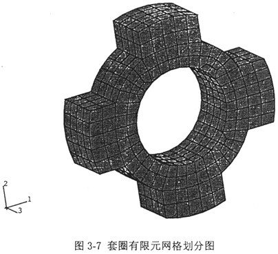 套圈是一個不規(guī)則的零件,先用有限元按三維八節(jié)點(diǎn)實(shí)體單元對它進(jìn)行網(wǎng)格劃分,圖3-7是有限元網(wǎng)格劃分圖。邊界條件是這樣處理的:由于套圈裝在減速機(jī)箱體孔中時(shí),和孔的配合是過盈配合,且套圈內(nèi)表面與傳動軸外表面也是過盈配合,故套圈的配合面處均按固支對待。經(jīng)ABAQUS有限元軟件處理后輸出質(zhì)量矩陣和剛度矩陣,然后用廣義的Collatz包含定理求出它的低階固有頻率。