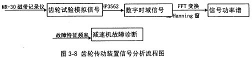 圖3-8是齒輪傳動裝置信號分析流程圖,用HP3562動態(tài)數(shù)字分析儀采集MR-30磁帶記錄儀紀(jì)錄的二級圓柱斜齒輪減速機(jī)試驗(yàn)過程中的模擬信號,可得到齒輪傳動裝置載荷、齒輪傳動裝置箱體動態(tài)激勵力應(yīng)變變化的時(shí)域信號,對此信號作FFT變換,可得到載荷譜和動態(tài)激勵力應(yīng)變變化時(shí)域信號的功率譜。為了防止功率譜泄露,在作FFT變換時(shí),需作加窗處理,由于試驗(yàn)采集的是隨機(jī)信號,故加漢寧(Hanning)窗處理。利用故障診斷特征參數(shù)一傳動零件可能發(fā)生故障的振動頻率及其振動頻率處的功率對試驗(yàn)信號進(jìn)行診斷分析。當(dāng)功率譜所包含的頻率成份難以區(qū)分時(shí),可采用倒譜分析。