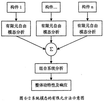 通過對系統(tǒng)中的各構(gòu)件進(jìn)行有限元自由模態(tài)分析,得到各構(gòu)件的自由模態(tài)(當(dāng)然也包含了6個剛體模態(tài)),以各構(gòu)件的連接關(guān)系為依據(jù),建立邊界條件,然后進(jìn)行模態(tài)綜合,即可計(jì)算得到整個系統(tǒng)的動特性和響應(yīng)。其過程如圖6-2。