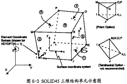 此單元為3-D固體結(jié)構(gòu)單元,由八個節(jié)點(diǎn)組成,在單元的每一節(jié)點(diǎn)上有三個自由度,即分別沿著三個坐標(biāo)軸的方向。此單元可以進(jìn)行塑性、蠕變、應(yīng)力硬化、大變形以及大應(yīng)變分析,是結(jié)構(gòu)分析中的最常用單元。單元結(jié)構(gòu)如圖6-3,此單元有兩種退化形式(見圖6-3右邊)。