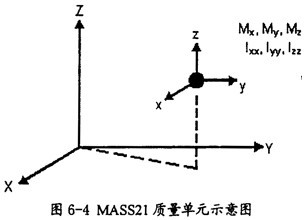 此單元為一個有六自由度的質(zhì)量單元。此單元的第一個不同的坐標(biāo)方向上可以施加不同的質(zhì)量大小和轉(zhuǎn)動慣量。質(zhì)量單元是由單個節(jié)點(diǎn)、單元坐標(biāo)方向的集中質(zhì)量系數(shù)、單元坐標(biāo)軸的旋轉(zhuǎn)慣性所決定的。為了在加入質(zhì)量單元后不影響系統(tǒng)的慣性屬性,在此單元的實(shí)常數(shù)設(shè)定中慣性量應(yīng)設(shè)定的非常。ㄈ缧∮10-4)。單元如圖6-4所示。