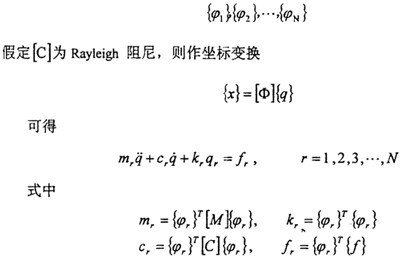 上述過程稱為模態(tài)疊加法, qr可以理解為第r階固有振動模態(tài)對實(shí)際振動{x}所作的貢獻(xiàn)。各階模態(tài)所作貢獻(xiàn)的大小除取決于結(jié)構(gòu)本身的特點(diǎn)外,還取決于結(jié)構(gòu)受激勵力的頻率范圍,以及激勵力分布的情況。理論上,對于一個N自由度的系統(tǒng),可以通過方程解耦確定模態(tài)坐標(biāo)響應(yīng),然后通過線性變換得到物理坐標(biāo)響應(yīng)。但實(shí)際上在一個系統(tǒng)的振動中僅是較少幾個模態(tài)在起主導(dǎo)作用,因此只考慮這些模態(tài)的作用,而無需求解全部的方程,這樣做雖然是近似的但卻有足夠滿意的精度,這便是模態(tài)疊加法的出發(fā)點(diǎn)。