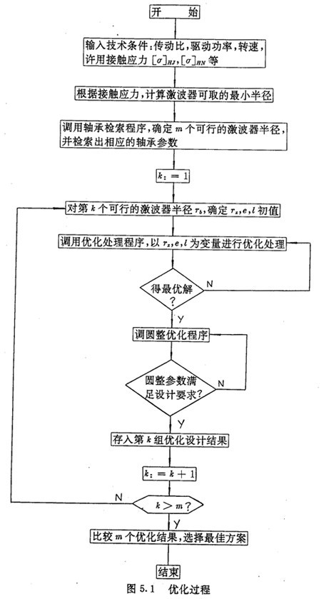 由于激波器一般使用通用軸承,所以激波器半徑Tb應結(jié)合軸承標準來選擇。在程序中,先給各傳動參數(shù)指定其取值范圍的中間數(shù)值,然后根據(jù)接觸應力計算,確定滿足強度條件的最小激波器半徑,由軸承檢索程序,確定若干個可行的激波器半徑。在確定可行的激波器半徑時,為了使減速器外徑尺寸不致過大,僅把與應力計算結(jié)果相近的軸承半徑及其相鄰型號半徑作為可行的激波器半徑。對每一個可行的激器半徑Tb,調(diào)用優(yōu)化子程序以TZ,e,l為優(yōu)化變量進行優(yōu)化處理。其算法流程如圖5.1所示。