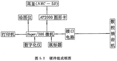 本系統(tǒng)是在一臺微型計算機super/386基礎上,增加一塊選進的圖形卡,一臺高分辨率顯示器,數(shù)控接口電路及相應設備,組成了一個微機工作站,如圖5.2所示。