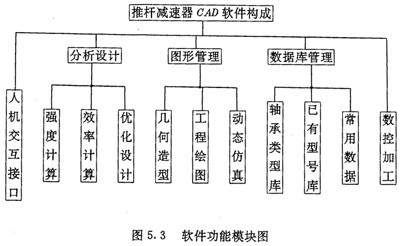 軟件主要由分析設計、圖形管理、數(shù)據(jù)庫管理及摟控加工四大部分組成,并提供了一個友好的人機交互接口界面用于實現(xiàn)漢字人機對話。本交互接口由三級推拉彈出式菜單組成。軟件模塊結(jié)構如圖5.3所示。各大模塊的主要功能及特點如下: