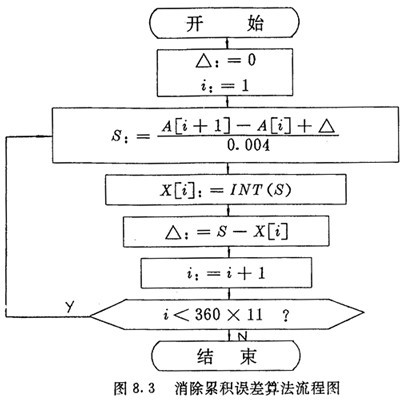 用式(4.4)及式(4.5)計(jì)算nx和nc時(shí),得到的不可能恰好是整數(shù),為了消除累積誤差,每段中應(yīng)把上一段的誤差考慮進(jìn)去。例如對(duì)nx的計(jì)算,假定表8.1中Pd的360×11個(gè)數(shù)已存在數(shù)組A中,計(jì)算后的360×11-l個(gè)脈沖數(shù)nx存在數(shù)組x中,則計(jì)算過(guò)程如圖8.3所示。