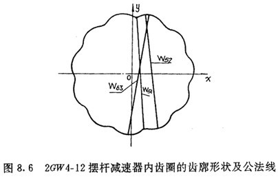將2GW4-12擺桿減速器的設(shè)計(jì)參數(shù)代入公法線(xiàn)條件式(7.79)中,并給外滾子半徑Tz以增量0.18mm代入,可得到三條不同長(zhǎng)度的公法線(xiàn),如圖8.6所示。