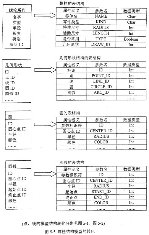在工程數(shù)據(jù)庫(kù)中,數(shù)據(jù)庫(kù)的對(duì)象模型參數(shù)有:零件名、零件類型、零件特性尺寸、是否常用、零件輔助尺寸、零件的幾何形狀。其中,零件特性尺寸是確定具體類型的要素,而零件的幾何形狀是零件圖形單元的繪制的依據(jù),是對(duì)零件拓?fù)潢P(guān)系的描述。下面以螺栓系列為例,由數(shù)據(jù)模型向表結(jié)構(gòu)進(jìn)行轉(zhuǎn)換,從復(fù)雜的結(jié)構(gòu)層層轉(zhuǎn)化為單一的結(jié)構(gòu),進(jìn)行詳細(xì)的敘述,見(jiàn)圖5-5。