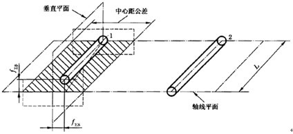 “軸線平面內(nèi)的偏差” f∑δ是在兩軸線公共平面上測(cè)量的,這公共平面是用兩軸承跨距中較長(zhǎng)的一個(gè)L和另一根軸上的一個(gè)軸承來(lái)確定的,如果兩個(gè)軸承的跨距相同,則用小齒輪軸和大齒輪軸的一個(gè)軸承!按怪逼矫嫔系牡钠睢 f∑δ是在與軸線公共平面相相垂直的“交錯(cuò)軸平面”上測(cè)量的。