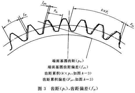 當(dāng)各齒通過嚙合時,單個齒距偏差在切向綜合位移圓弧上有累積作用。這種影響在切向綜合偏差圖上看得很清楚,這樣,可確定齒距累積偏差值,(比如k=2.3,…)即在適當(dāng)數(shù)量的齒距間測頂點切線的縱坐標(biāo)。圖28中表示了單個齒距偏差、單個齒距和齒廓組合偏差以及近似的齒距累積總偏差。