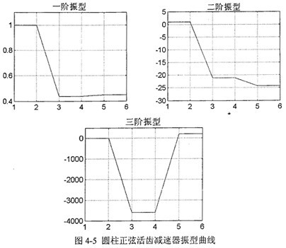根據(jù)式(4-9)、(4-10)及(4-12)計(jì)算出固有頻率、勢(shì)能分布率和模態(tài)柔度見(jiàn)表4-2。利用Matlab編制程序還繪制出圖4-5所示的減速器系統(tǒng)的振型曲線。