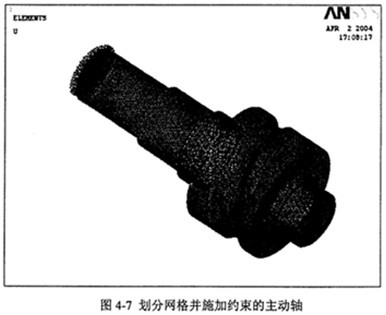 四面體單元每個(gè)節(jié)點(diǎn)有三個(gè)自由度(Tx,Ty,Tz),通過(guò)限制節(jié)點(diǎn)的自由度,對(duì)模型施加約束。模擬軸承的作用,在安裝軸承處的零件表面施加約束,首先將表面上所有節(jié)點(diǎn)的坐標(biāo)由笛卡爾坐標(biāo)(x,y,z)轉(zhuǎn)換為柱坐標(biāo)(R,θ,Z),然后限制自由度R。并在主動(dòng)軸的輸入軸端面和導(dǎo)架的輸出軸端面,限制所有節(jié)點(diǎn)的自由度。劃分網(wǎng)格并施加約束的主動(dòng)軸見(jiàn)圖4-7。