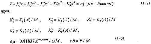目前文獻(xiàn)上的一些方法對于弱非線性系統(tǒng)是有效的,而對于(4-2)式的強(qiáng)非線性系統(tǒng)則遇到了麻煩。由于描述非線性振動系統(tǒng)的微分方程種類繁多,沒有普遍的解法,因此,仍然只有極少非線性振動方程可求得精確解。可行的辦法是針對不同非線性振動方程的特點尋求一些近似數(shù)值解法。為研究方便,將(4-2)式進(jìn)一步寫成以下形式: