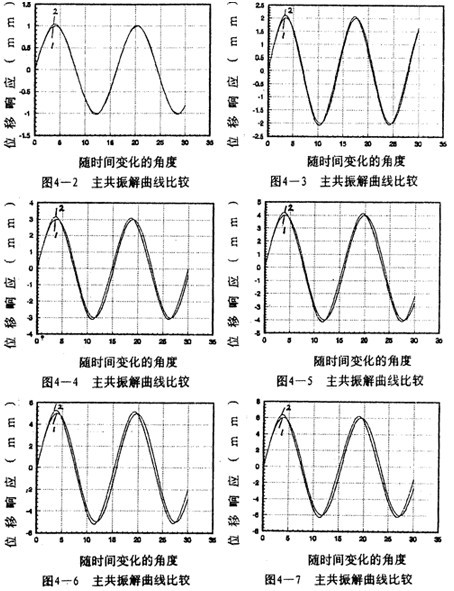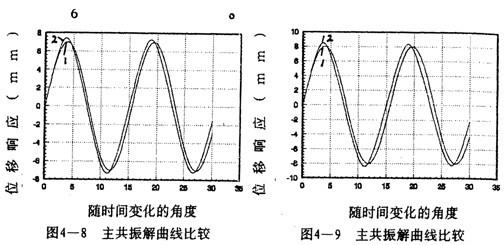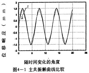 =2時兩者的重合性很好。(2).隨著振幅的增大,解析解曲線1和仿真解曲線2在相位上產(chǎn)生微小變化,解析解的相位超前仿真一個小量,原因是隨著振幅的增大,系統(tǒng)呈現(xiàn)更為強(qiáng)烈的非線性,而在推導(dǎo)中略去了高次項,但還是可以滿足工程的要求。(3)從(4-78)-(4-85)式中的各δ值可知,在聯(lián)軸器產(chǎn)生主共振的情況下,激振力很小。