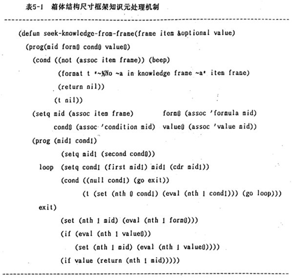 最后,測試取值條件(value)側(cè)面,若對取值有限制,則檢驗(yàn)所計(jì)算值是否滿足紅束條件;如對delta值的限制,若delta≤8,則取delta=8。對箱體知識的求值過程的LISP函數(shù)如表5-1: